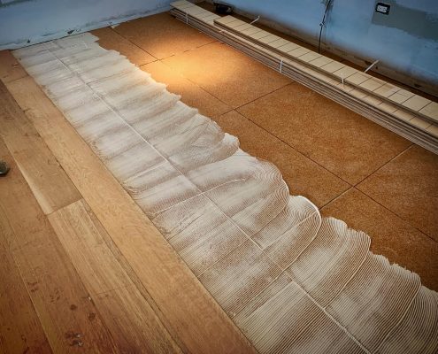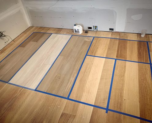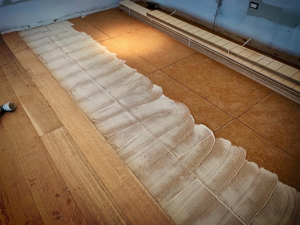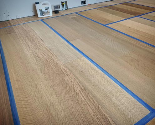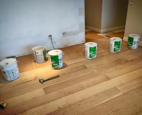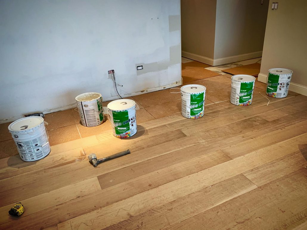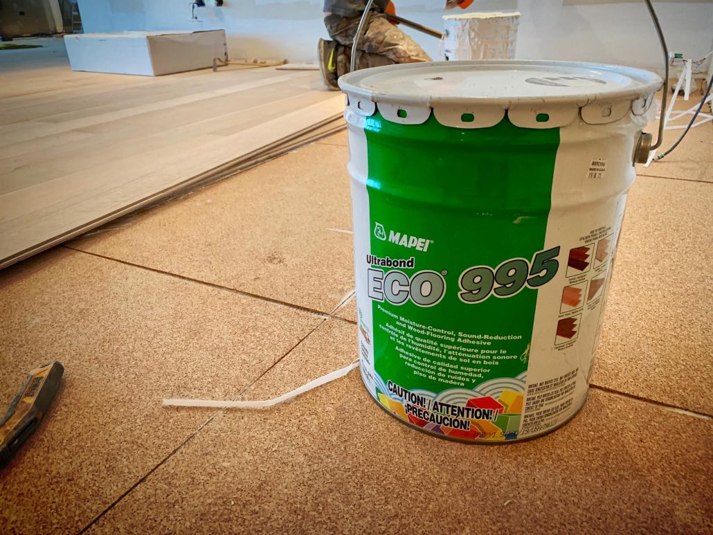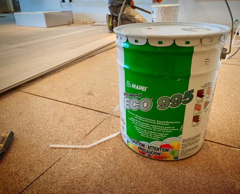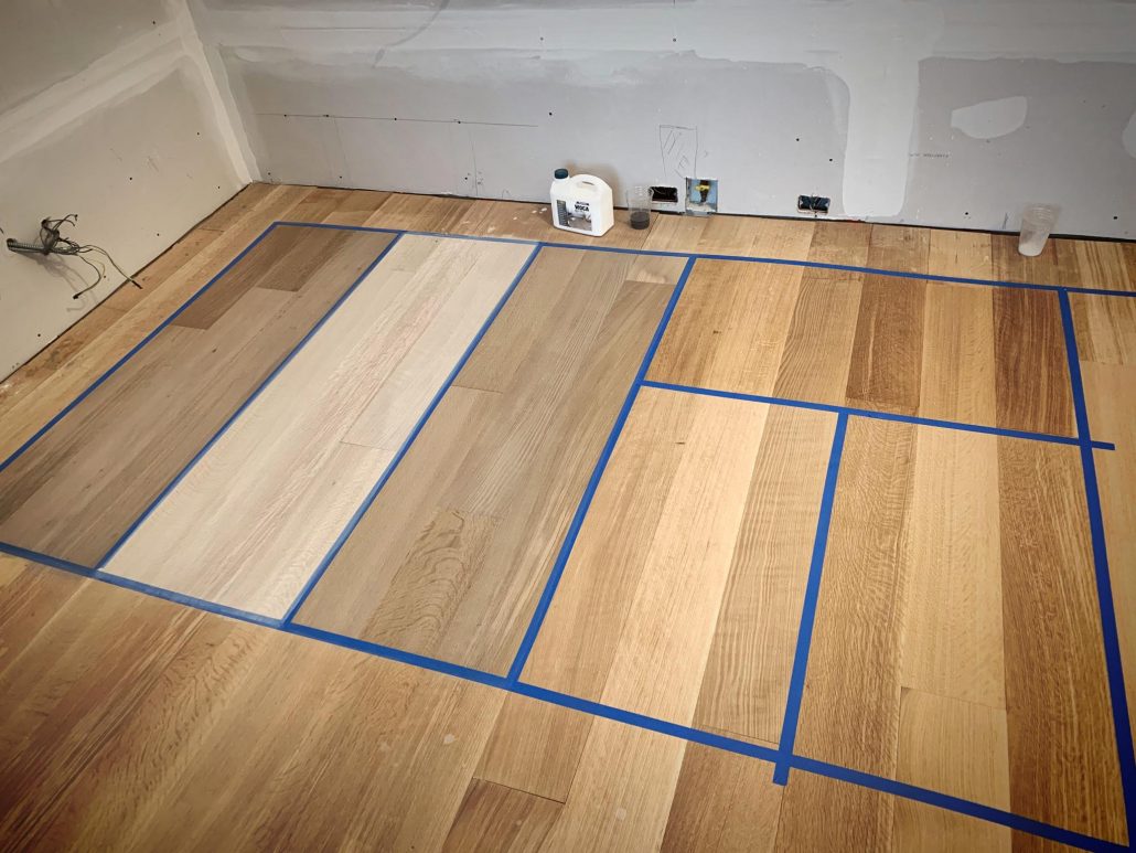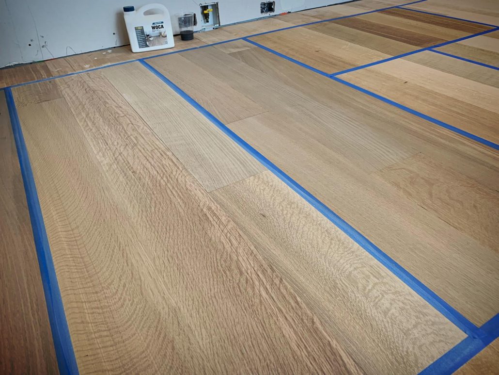 Glue-Down Engineering Hardwood Floor Installation – White Oak Rift & Quartered 7”wide . Sample color with Woca Wood Lye White, and Woca Wood Lye Gray 😜 . Provides a lighter finish, The priming prevents the wood from yellowing and enhances the wood grain creating a colored wash effect, depending on the chosen color.