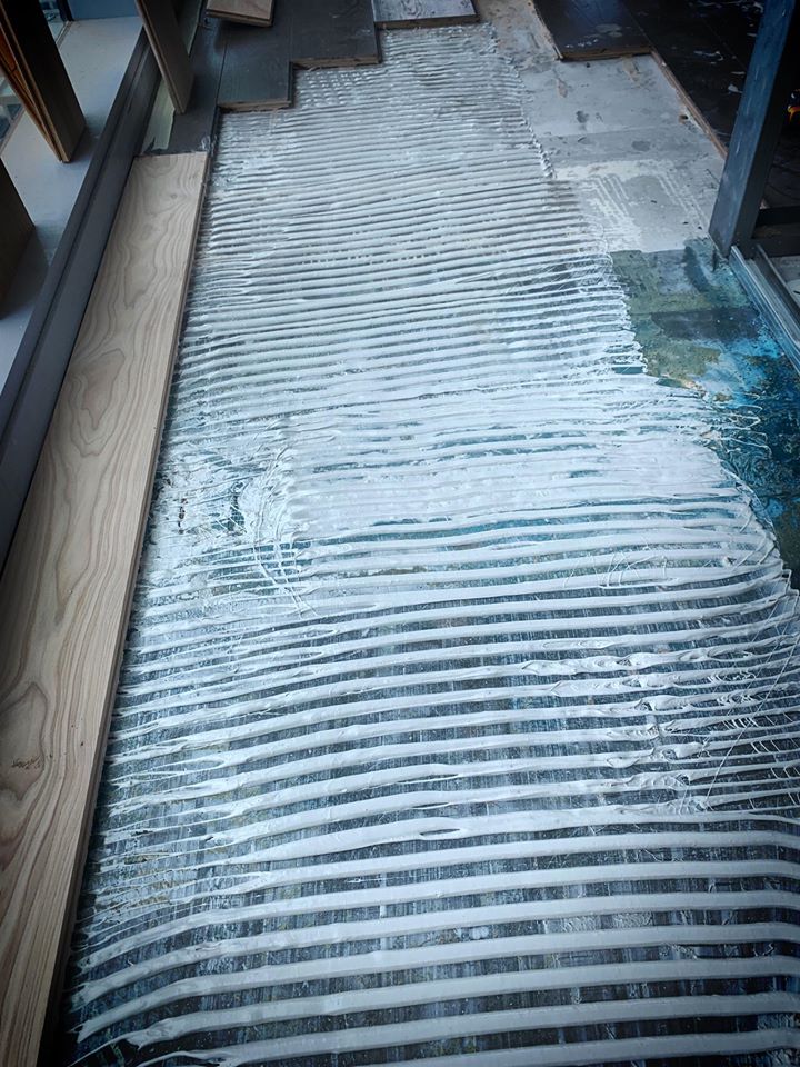 Glue down Installation Graf Brothers manufacturing Hickory Engineered Hardwood Flooring Mix 6” , 8” , 10” .