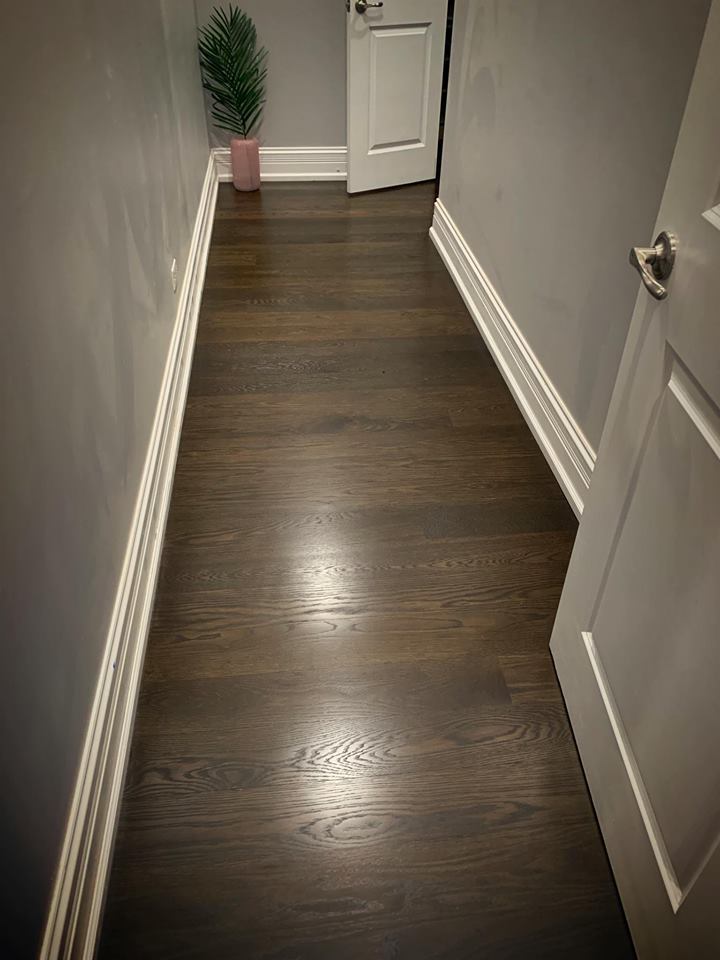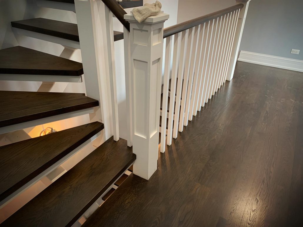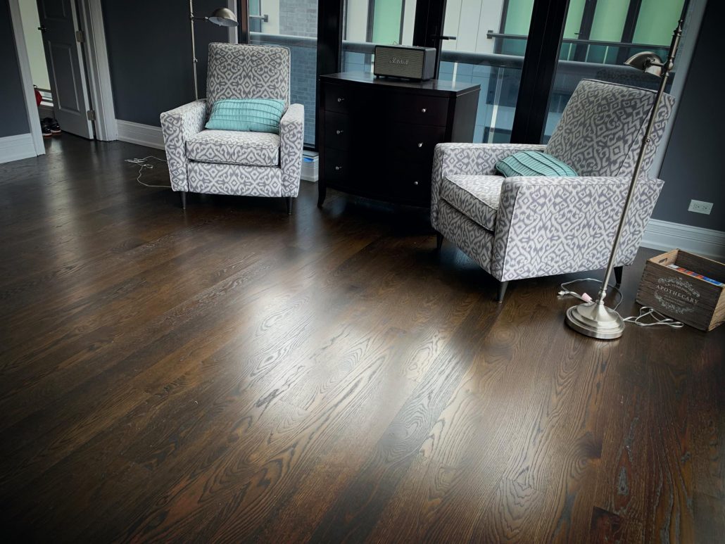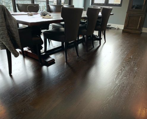Beautiful flooring especially when finished sanding by Lagler Trio. Perfect flat and smooth Graf Brothers White Oak 5” x 3/4” – custom colors mix dark brown Bona stain