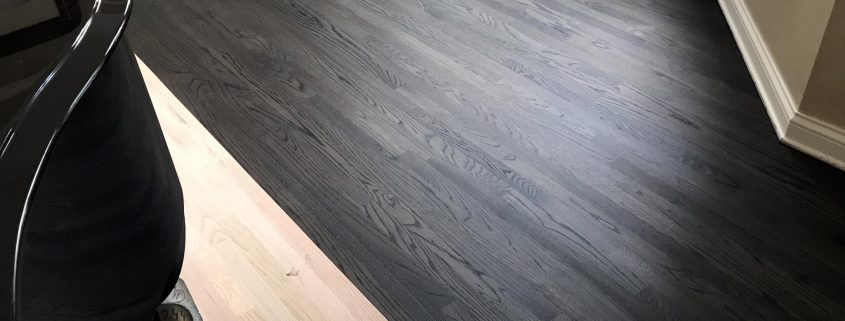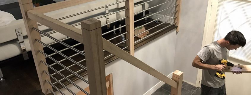 Schamburg Installation of new modern stainless steel tubing 3/4″ horizontal balusters, custom railing and newel post square white oak