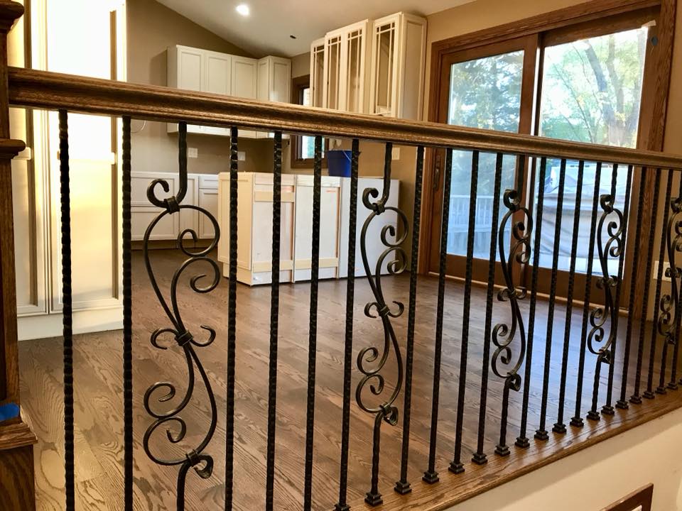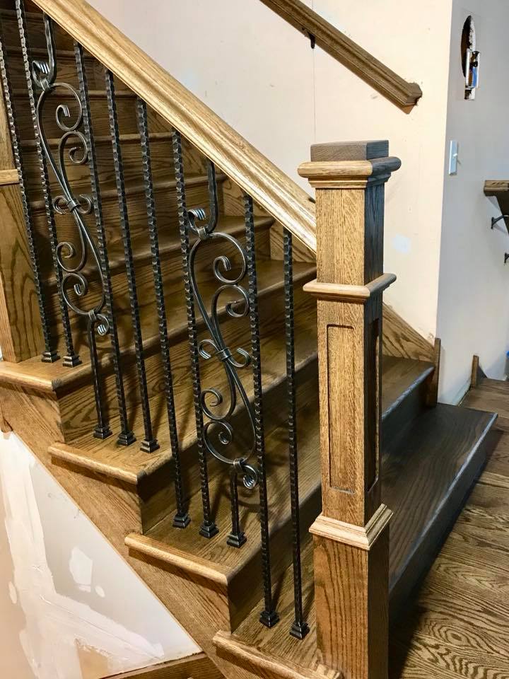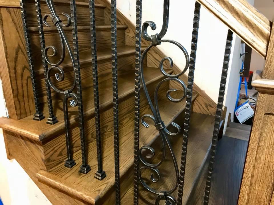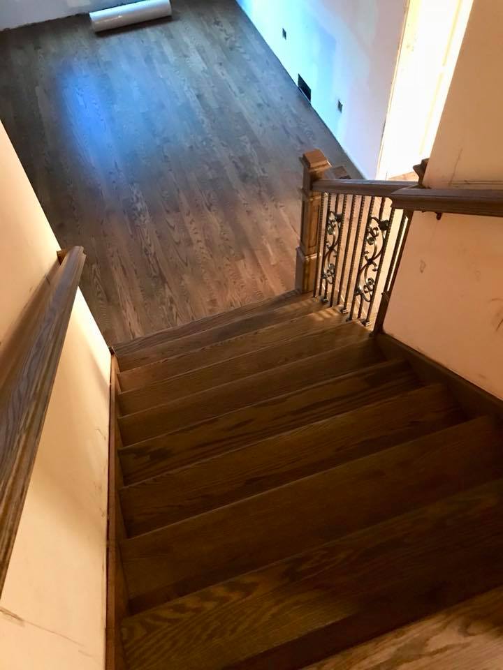 Prospect Heights – Refinishing Hardwood Floor Red Oak 3 1/4” and new staircase design iron balusters .