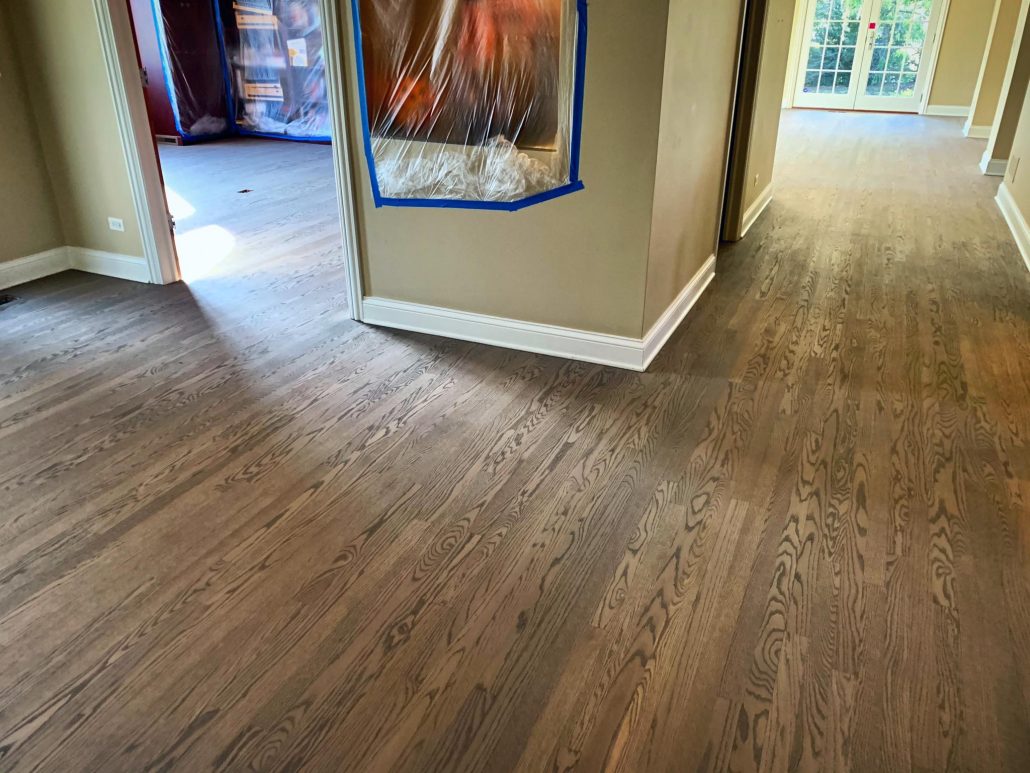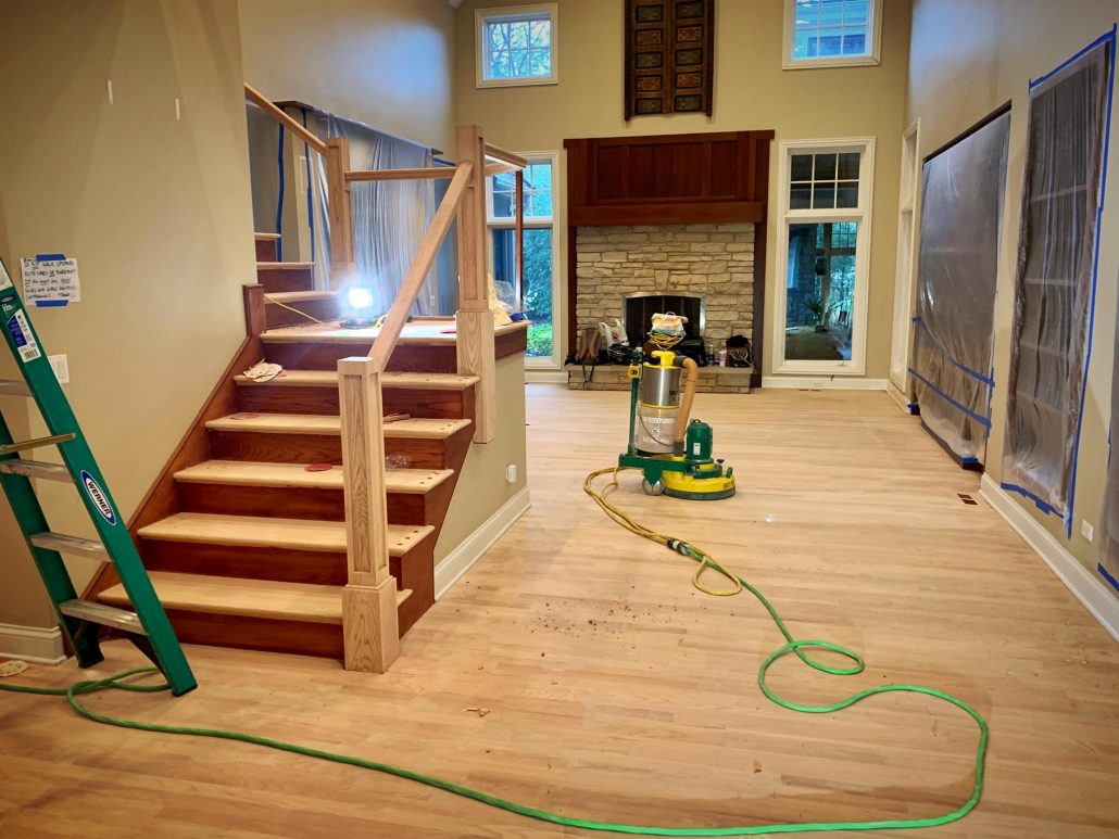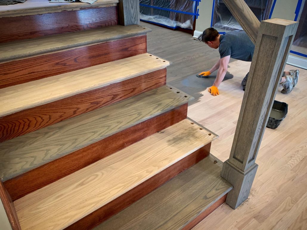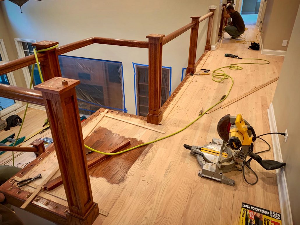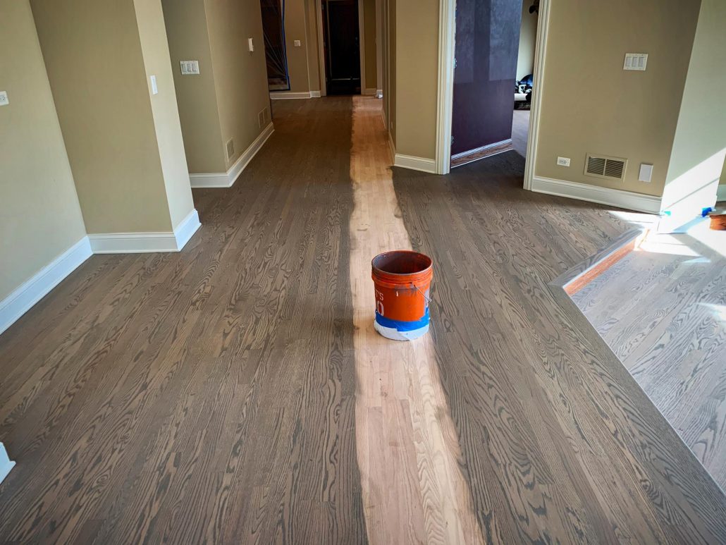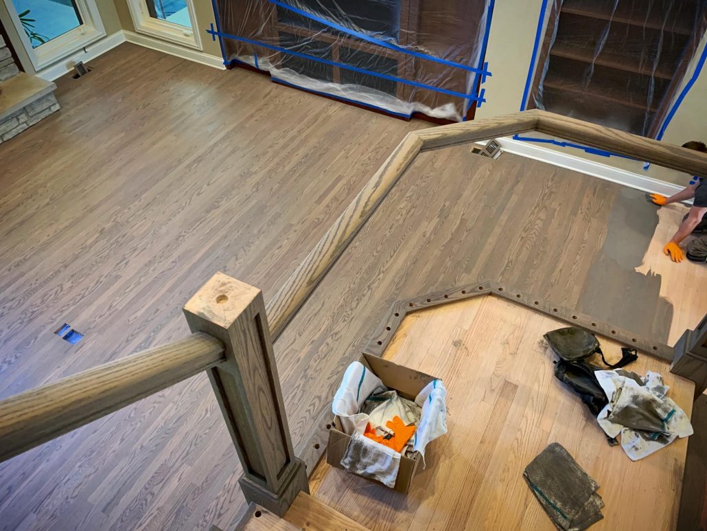 Beautiful project Refinishing Red Oak 2 1/4” hardwood floor and staircase today applying Bona stain custom color