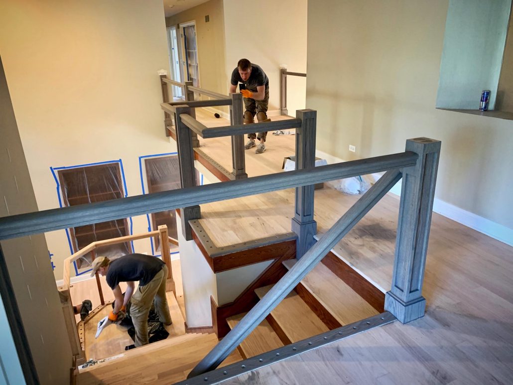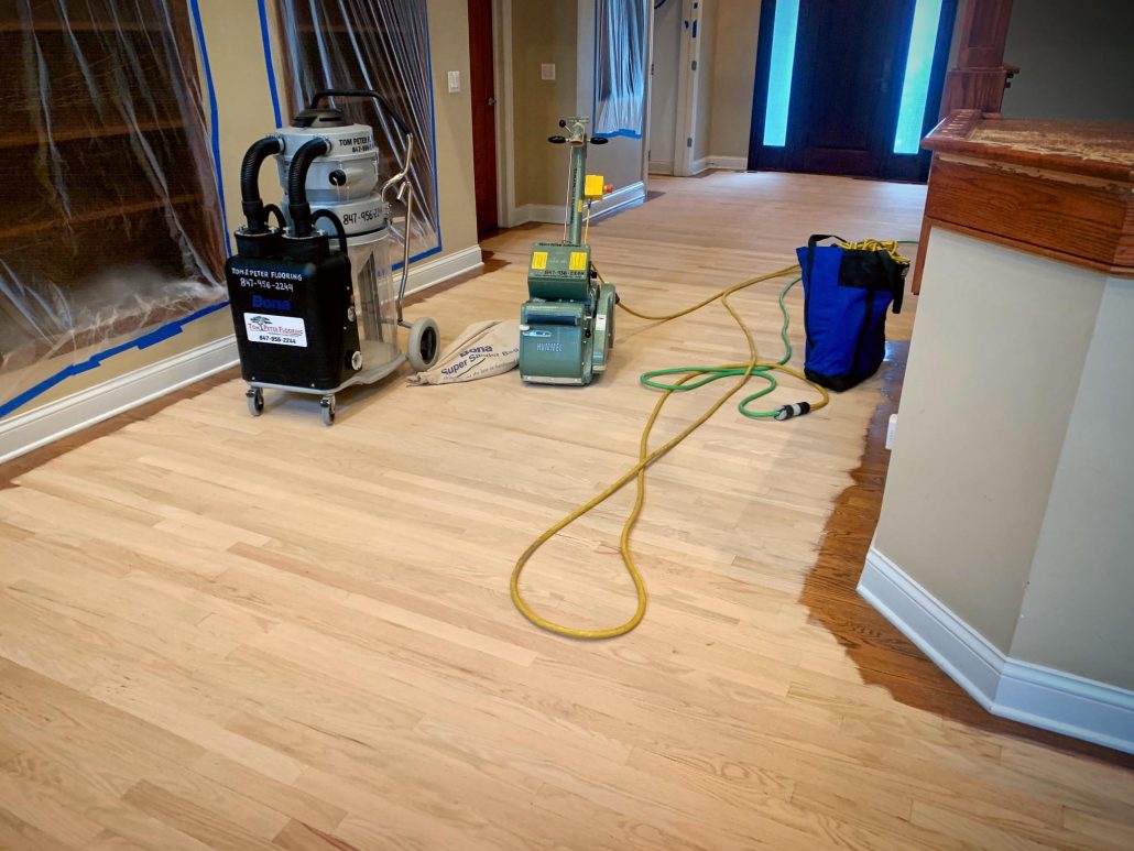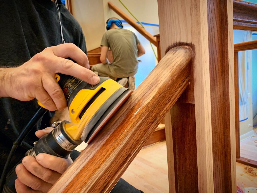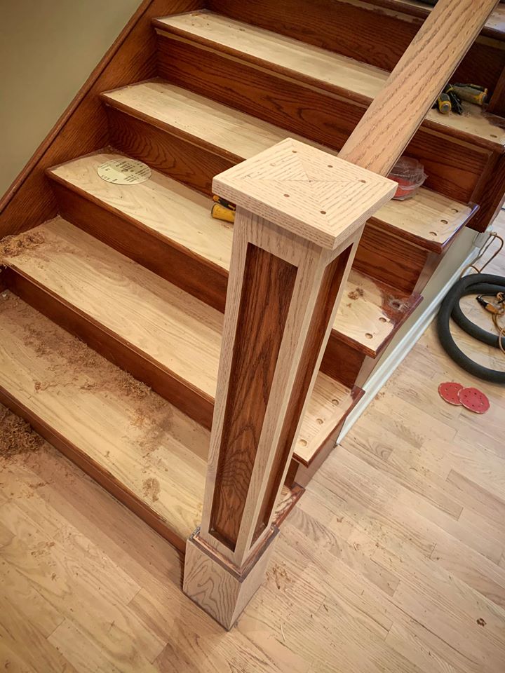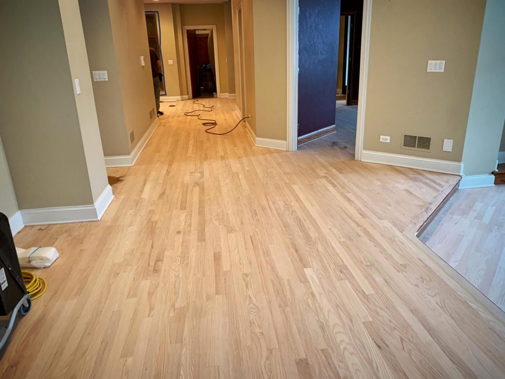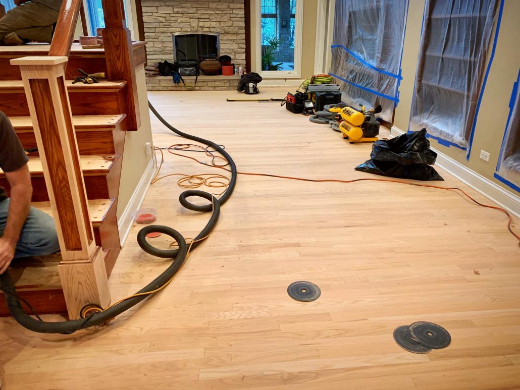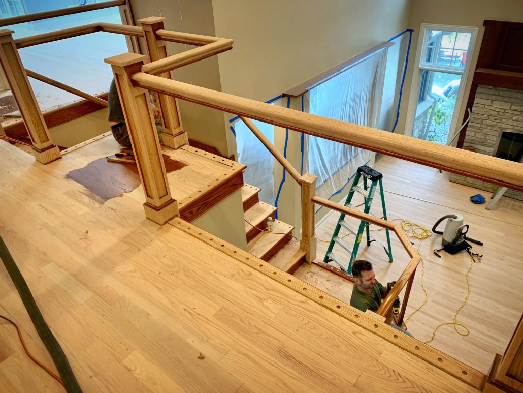 Beautiful project Refinishing Red Oak 2 1/4” hardwood floor and staircase today applying Bona stain custom color