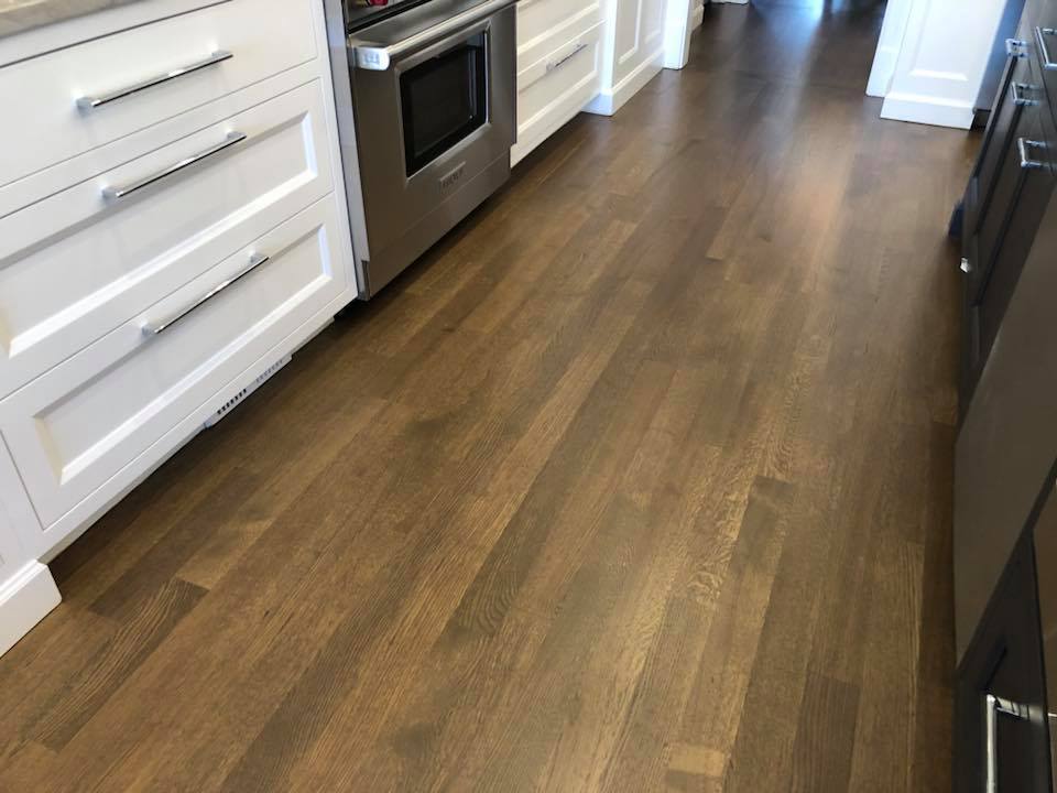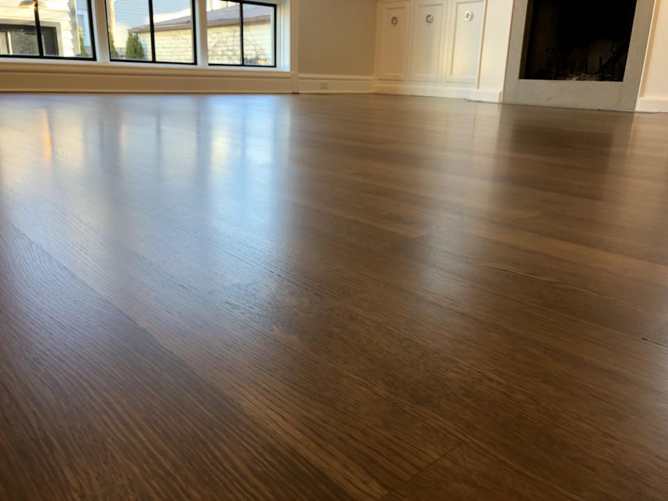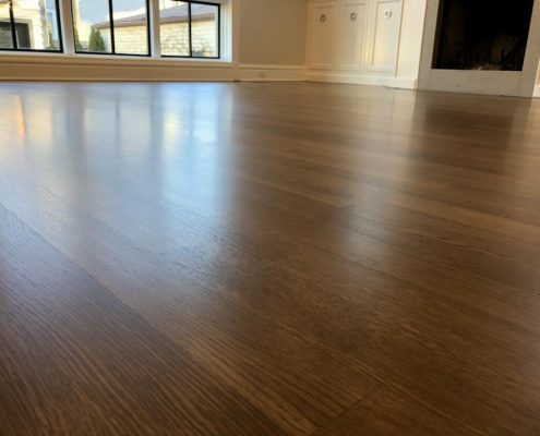 Refinishing Hardwood Floor and Staircase in Chicago – White Oak 3,1/4” Rift & quartered – Finishing Lagler Trio – Floor is perfectly flat and smooth. Apply Bona Custom Mix Stain 3parts Jacobean + 1parts Gray and Bona H Traffic Satin Finish . Please see pictures below