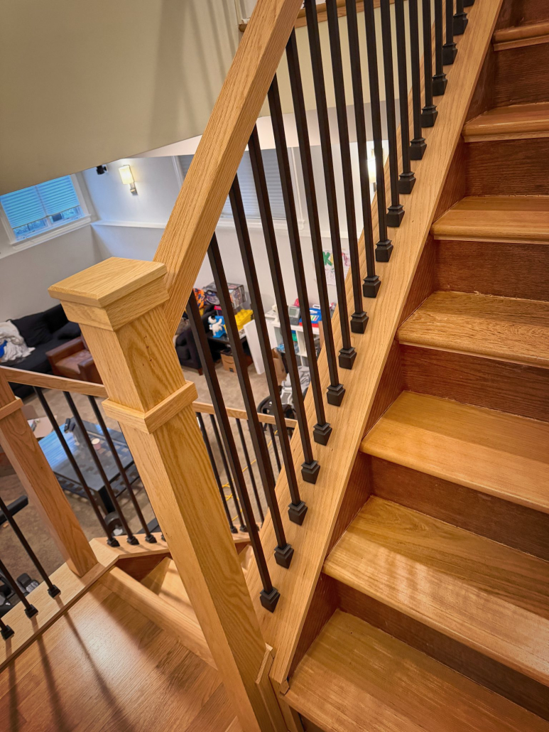 We use professional sanding techniques, including dustless sanding, and premium finishes to restore your stairs and match them perfectly with your hardwood floors.