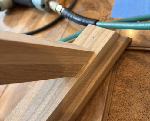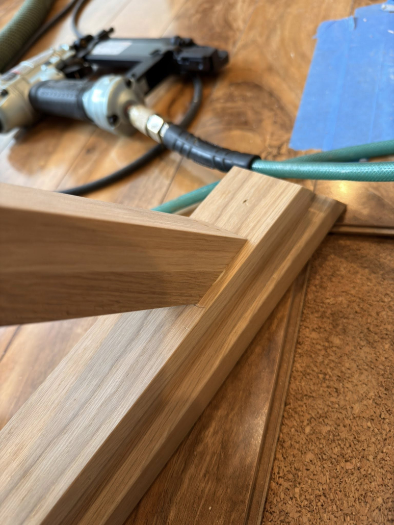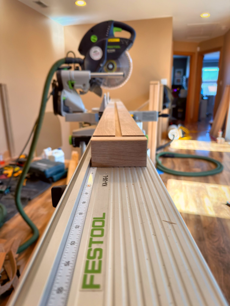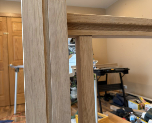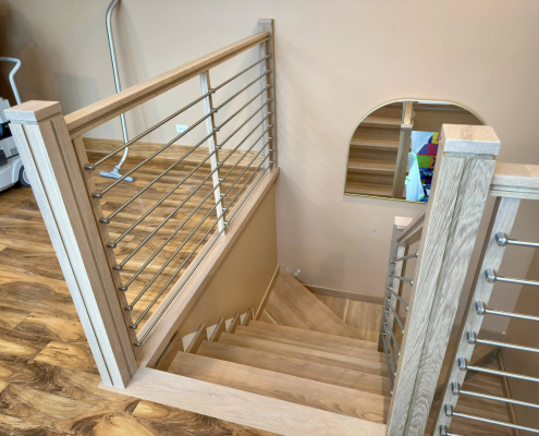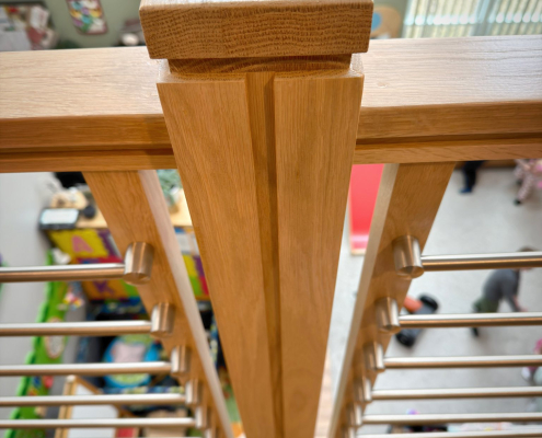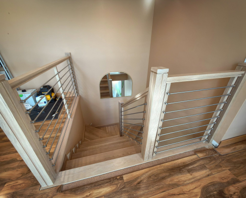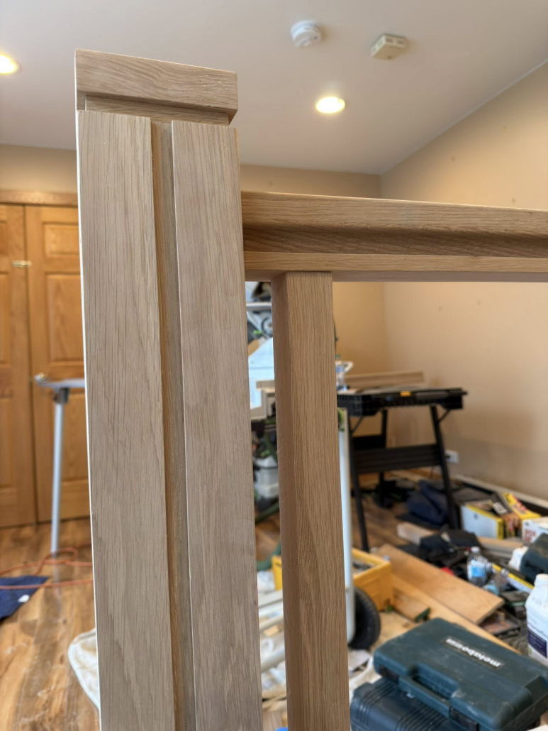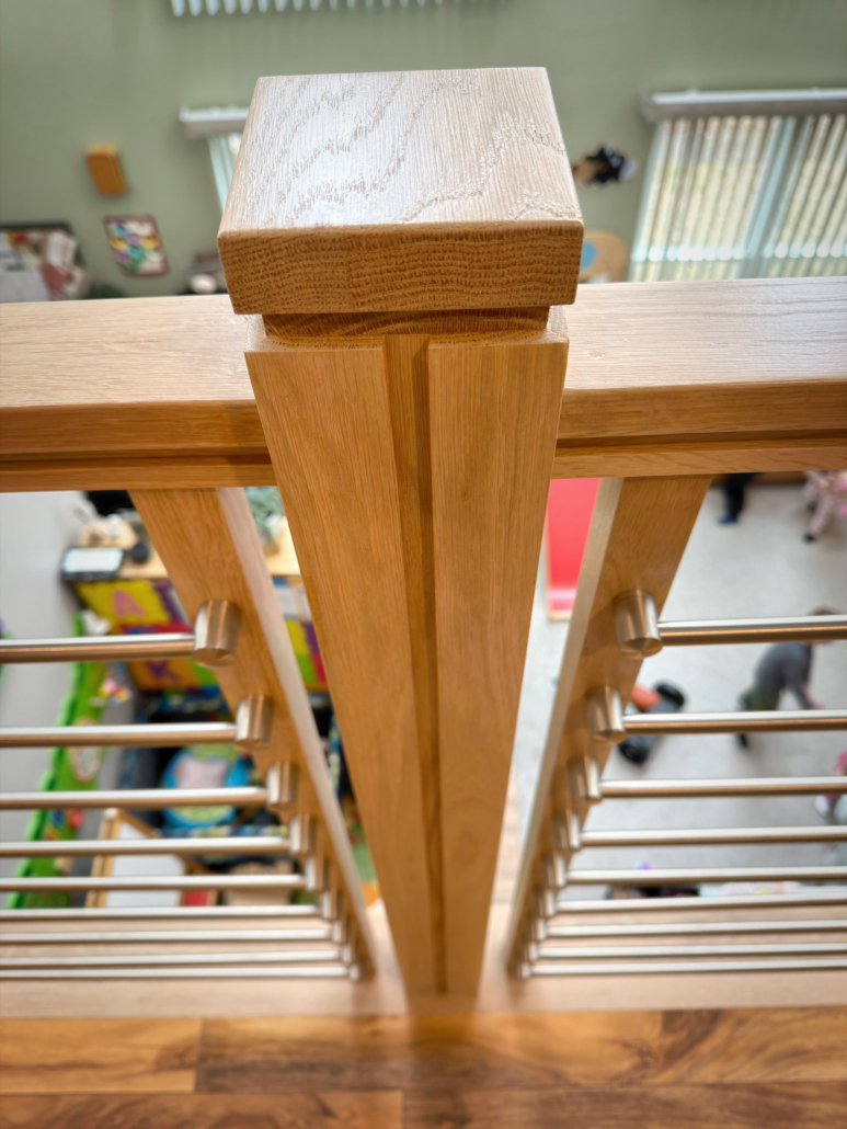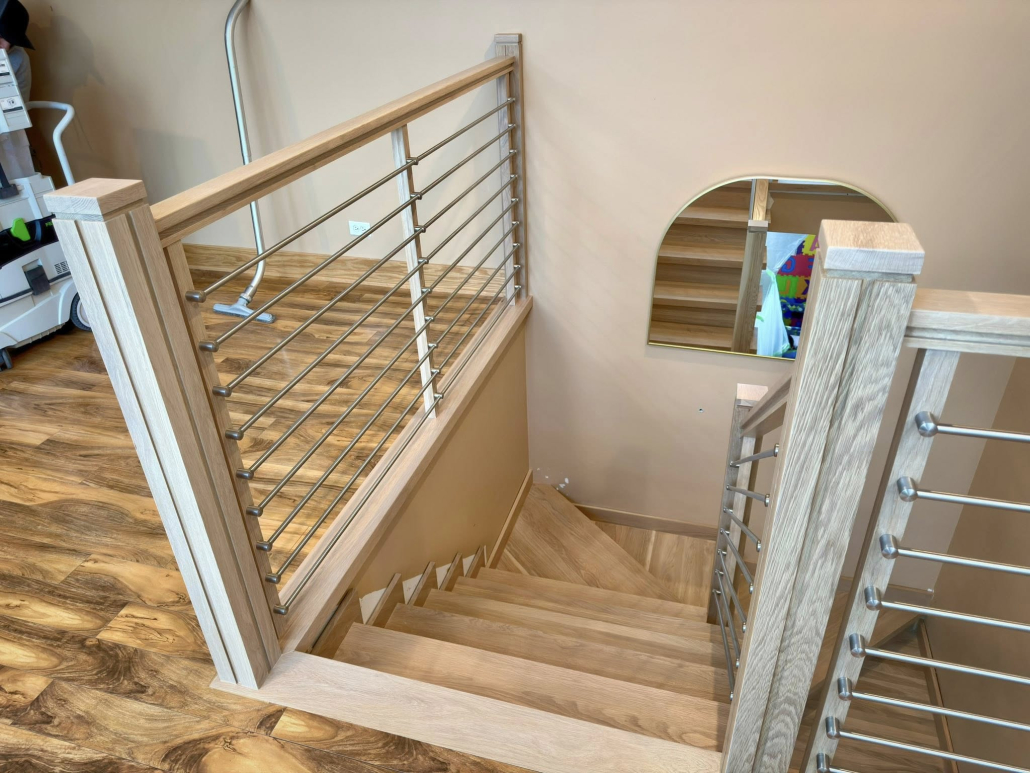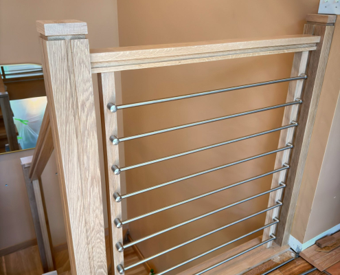Solid White Oak Custom Newel Posts: These square, custom-crafted posts offer a sturdy, modern anchor for the new railing system.