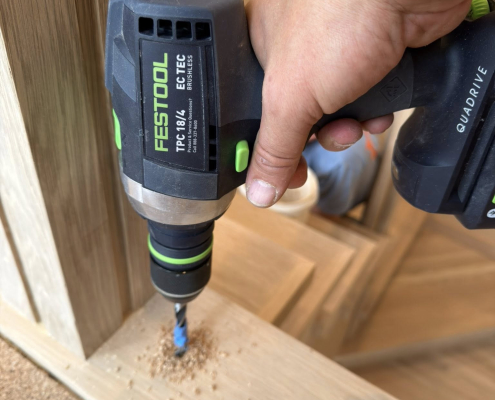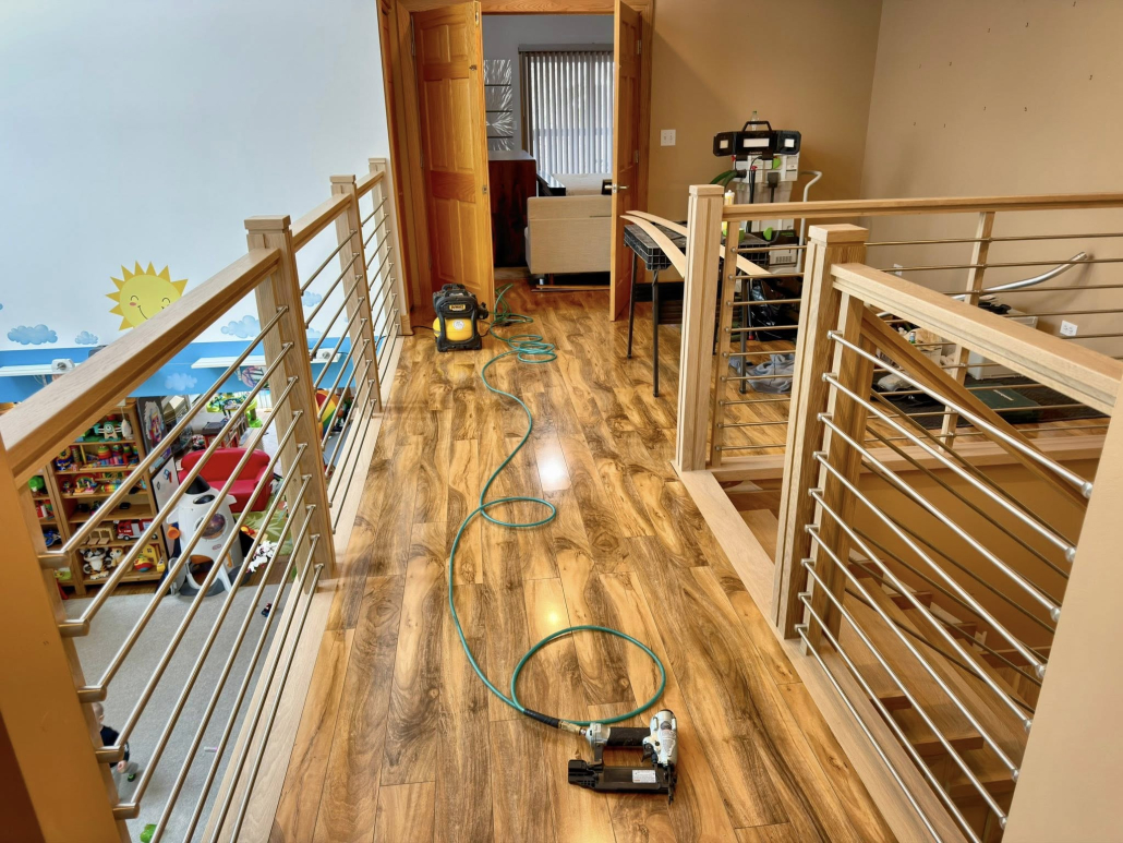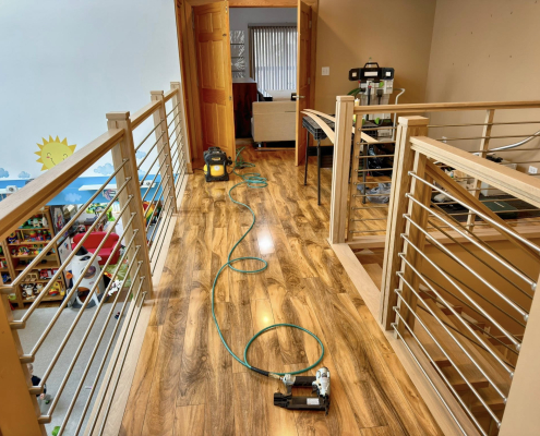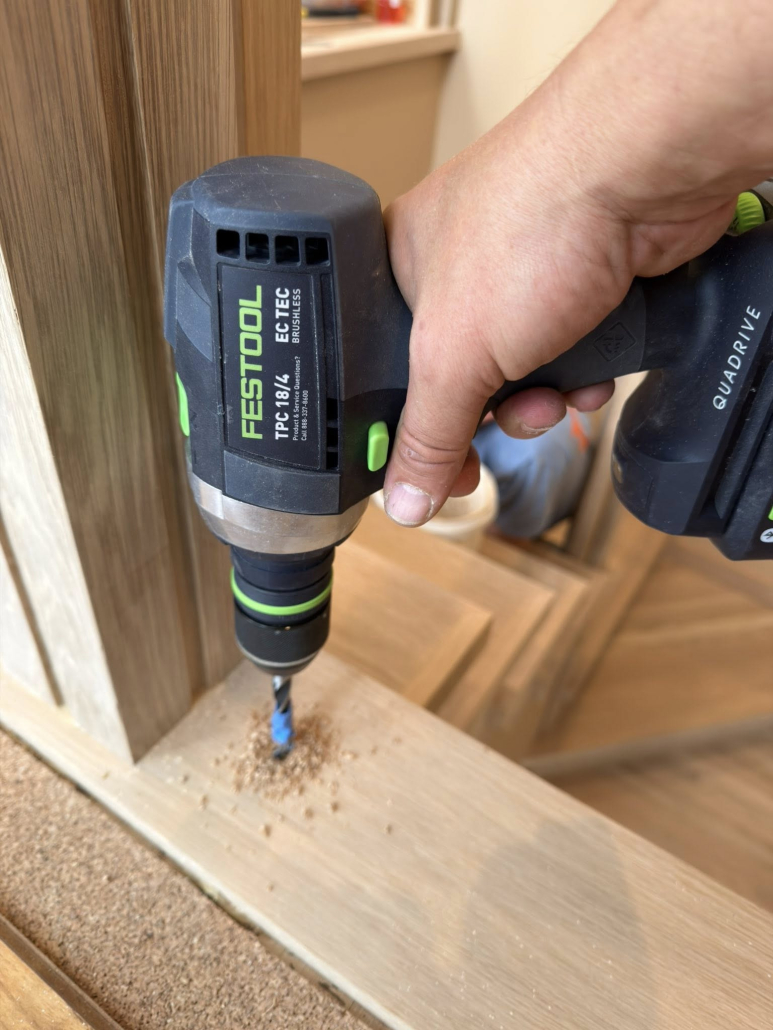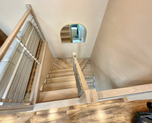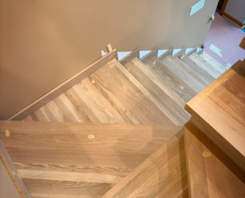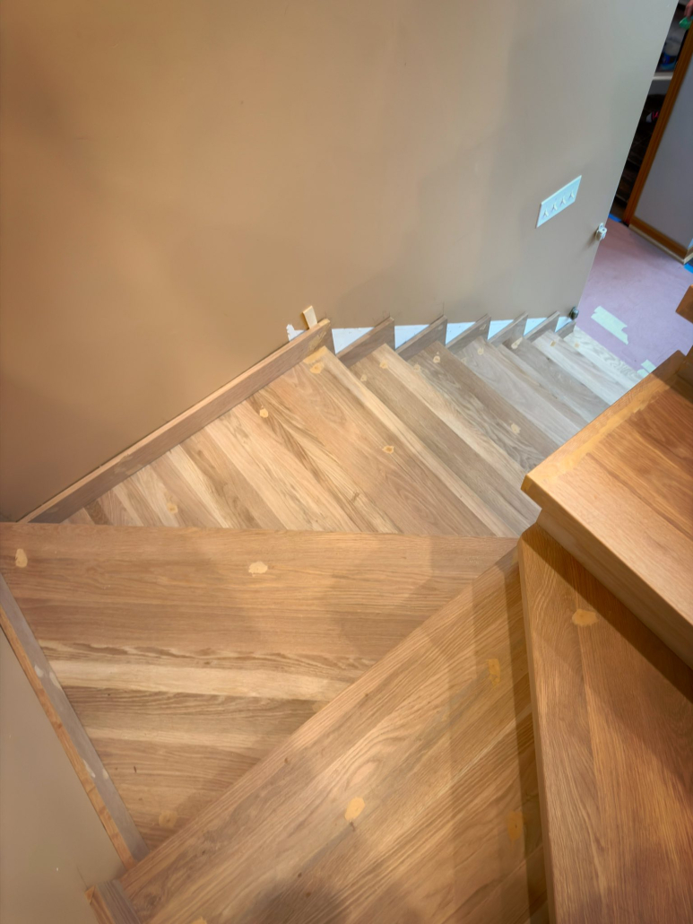 Aesthetics are important, but safety on stairs is paramount. We finished the wood components with Bona Traffic HD Anti-Slip in a Satin finish. This provides: